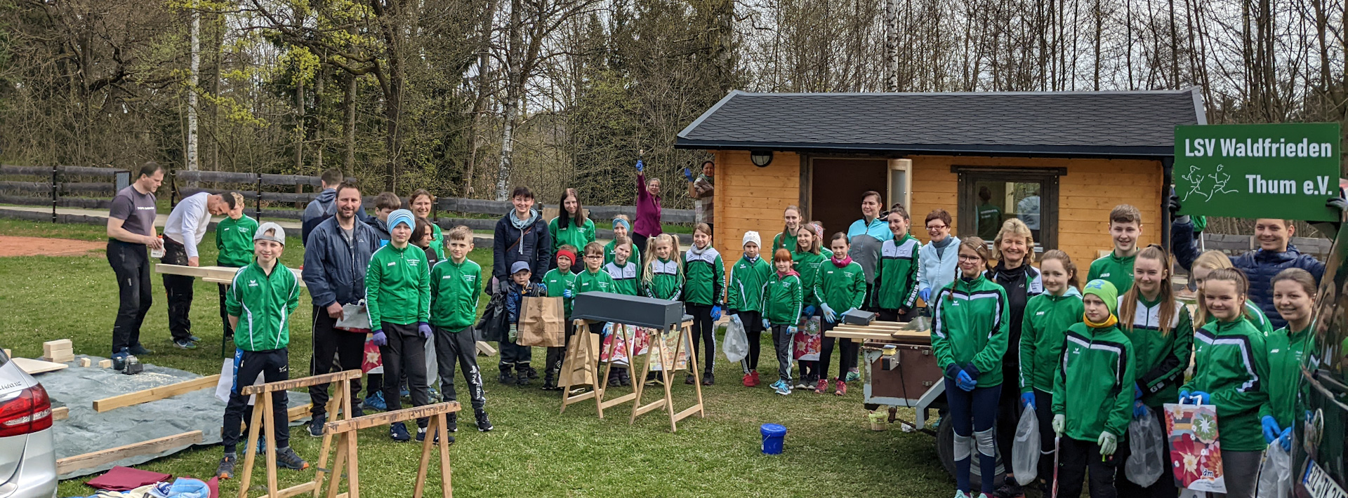 Während die Kindergruppe den Wald vom Müll befreit, sind viele andere Vereinsmitglieder beim Frühjahrsputz am Vereinsheim tätig. Es wurden vorbereitende Arbeiten für den anstehenden Pfingstlauf am Vereinsheim erledigt. Das im Herbst errichtete Blockbohlenhaus erhielt Dank fleißiger Helfer einen letzten Feinschliff.