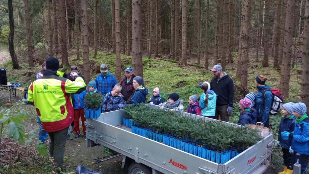 Die Standorte für die Bäume wurden schon im Vorfeld von Mitarbeitern des Sachsenforstesausgewählt und grob vorbereitet. So konnten die Kinder mit Pflanzhölzern schnell tiefe Löcher bohren, die Tannen an ihren neuen Standort behutsam einpflanzen und gut andrücken.