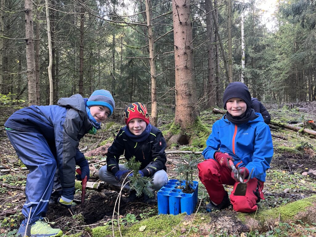Von unserem Treffpunkt an der Greifensteinstraße aus sind wir am Morgen bei sonnigem Wetter gemeinsam in den Wald gestapft. Hier haben wir unseren Revierförster, Tobias Hamm, getroffen. Nach einer interessanten „Unterrichtseinheit“ rund um die geplanten Baumpflanzungen, das Anbringen von Schafwolle an Jungbäumen und den Borkenkäfer ging es an die Arbeit: wir haben 175 Weißtannen gepflanzt und viele junge Tannen mit Schafwolle vor Wildverbiss geschützt. Mit ca. 50 Leuten waren wir sehr tatkräftig und schon nach knapp zwei Stunden fertig.
